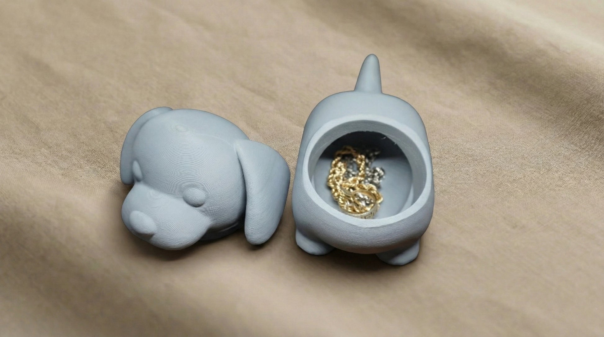 A decorative Dachshund with a twist. The head lifts off to reveal hidden storage inside perfect for jewelry, keys, or small everyday items. Cute on the outside, practical on the inside. Designed to sit anywhere and keep your essentials in one place.