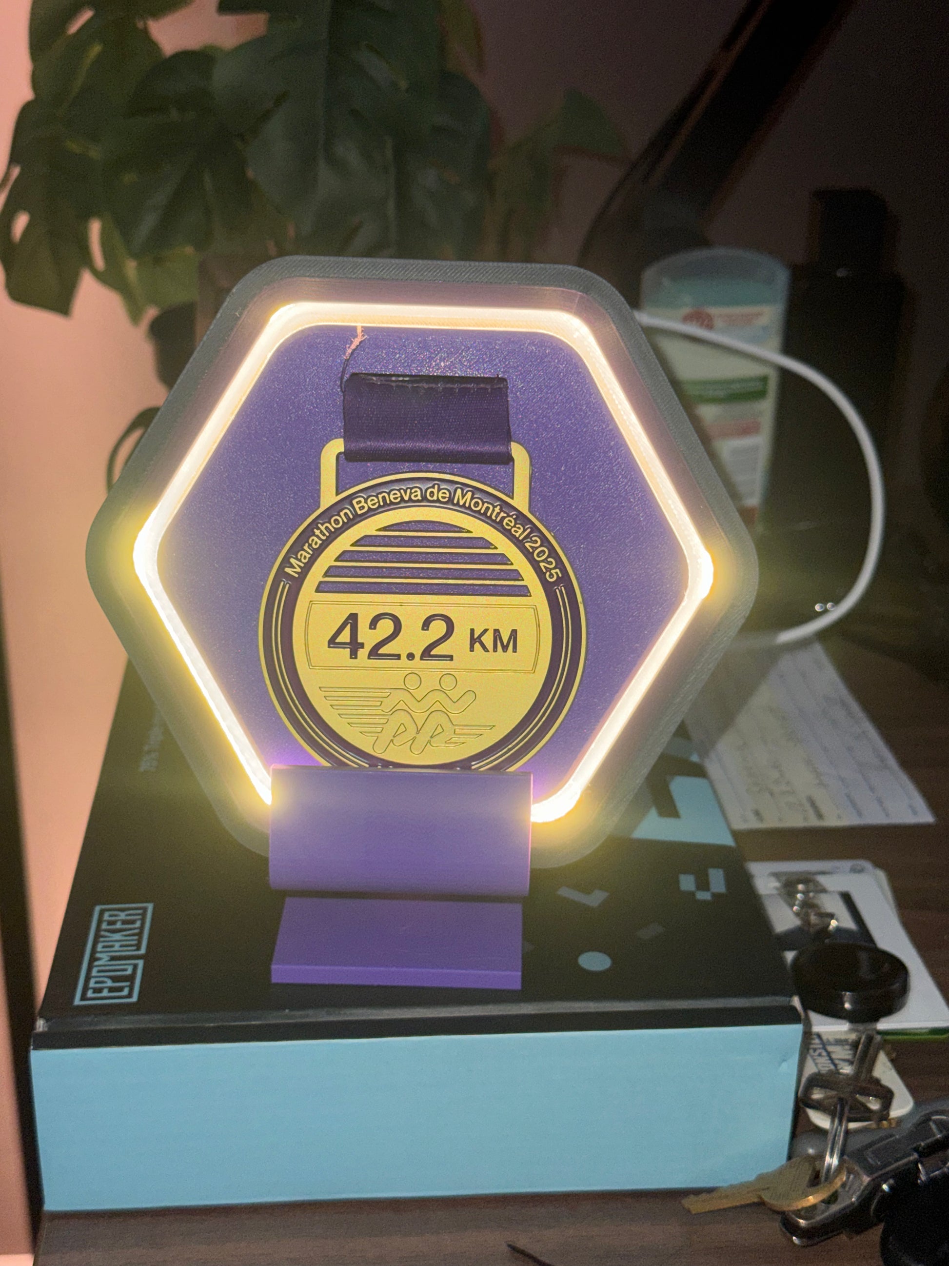 Showcase your achievement in style with this exclusive Montreal Beneva Marathon Medal Display. Designed with a sleek black base and a built-in LED light, it highlights your medal at the center while keeping the wire discreetly hidden in the back for a clean finish. Perfect for runners who want to celebrate their hard work and add a modern touch to their space.